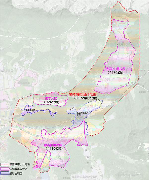 詳細(xì)城市設(shè)計(jì)包括3個(gè)片區(qū),總面積約2832公頃。其中,原吉陽(yáng)鎮(zhèn)片區(qū)面積約1130公頃,南丁片區(qū)約326公頃,大茅-中廖片區(qū)約1376公頃(詳見規(guī)劃范圍示意圖)。