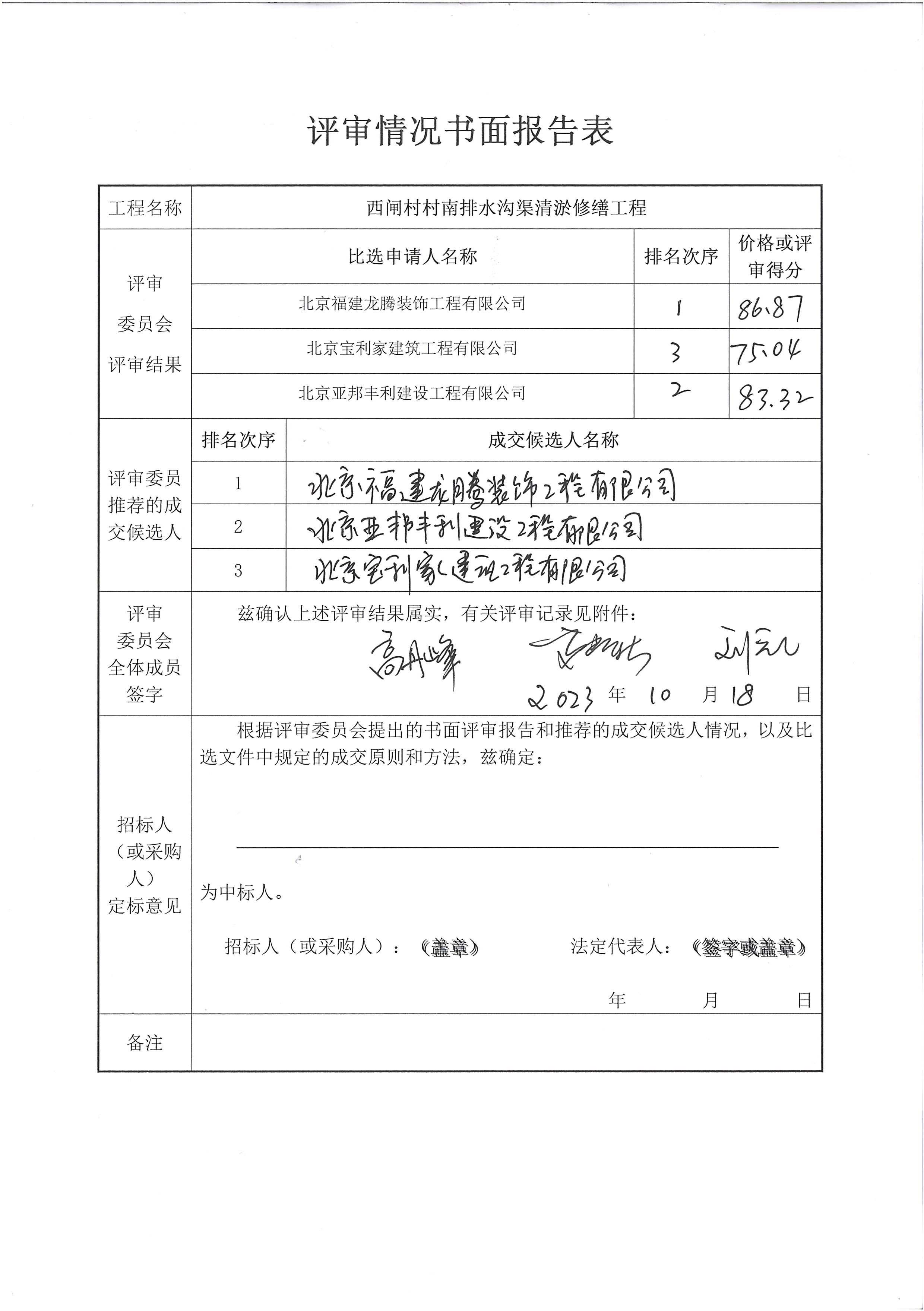 西閘村村南排水溝渠清淤修繕工程中選公告